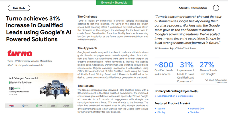 As a result, Turno achieved a 31% increase in Sales Qualified Conversions. Empowered by this success, Turno boldly increased investment in Google ad networks by 2.7 times. Turno isn't just a name anymore; it's a complete solution provider for commercial electric vehicle solutions.
